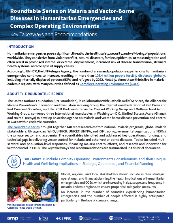 The United Nations Foundation (UN Foundation), in collaboration with Catholic Relief Services, the Alliance for Malaria Prevention’s Innovation and Evaluation Working Group, the International Federation of Red Cross and Red Crescent Societies, and the RBM Partnership’s Vector Control Working Group and Multi-sectoral Action Working Group, convened three international roundtables in Washington D.C., Accra, and Nairobi to develop an action agenda on malaria and vector-borne disease prevention and control in COEs within endemic countries.