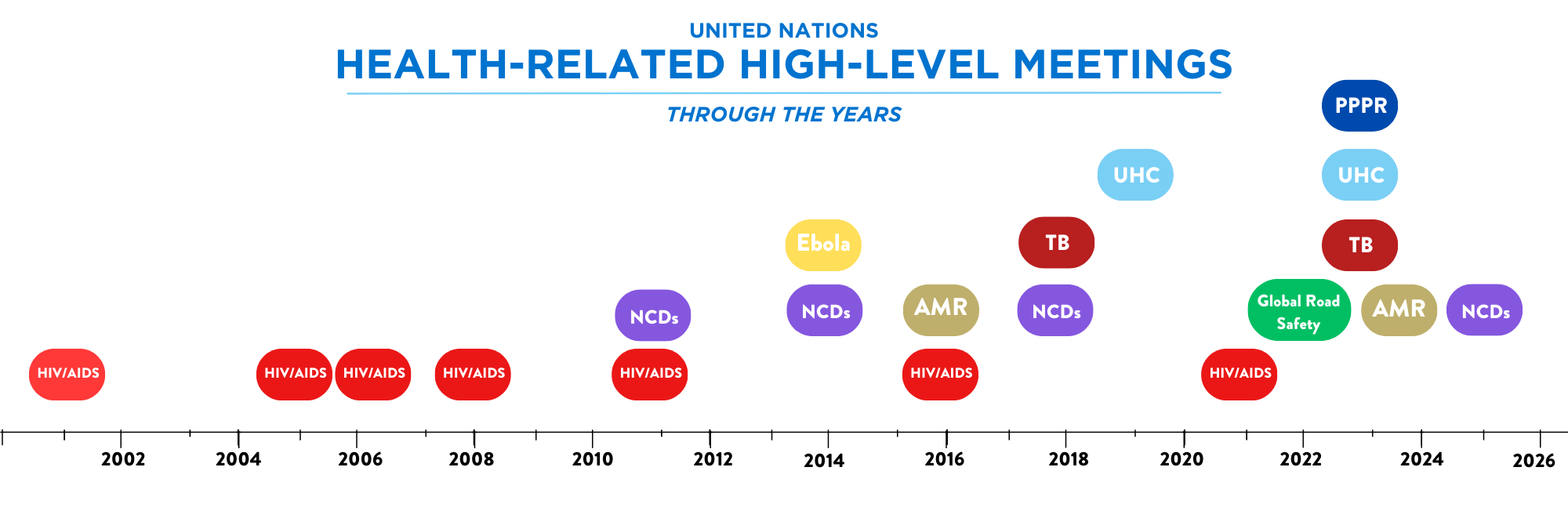 HIV/AIDS has been the subject of the greatest number of high-level meetings on health. Non-communicable diseases (NCDs), the number one cause of death and disability worldwide, was the next health-related issue to enter the New York diplomatic space with high-level meetings taking place in 2011, 2014, and 2018 and another scheduled for 2025. Within the past decade, an array of other health issues have made their way to New York, including Ebola (2014), antimicrobial resistance (2016 and 2024), tuberculosis (2018 and 2023), universal health coverage (2019 and 2023), global road safety (2022), and pandemic prevention, preparedness, and response (2023). The figure below depicts the proliferation of attention on an increasingly diverse range of health issues.